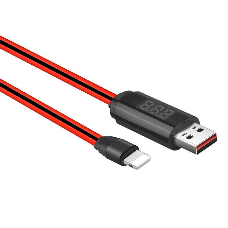 U29 LED displayed timing charging data cable for Lightning 1.2m with TPE braid and ABS connectors 2A output support1. Length: 1.2m, weight: 28g.2. Outer cladding:TPE material, appearance is novel, charging head is ABS casing.3. Eight side diamond data line, after charging, the screen is lit, and the voltage, current, charging time and other data are displayed alternately. You can also use timer to stop the charging!4. Wire core: tinned copper, 164 pieces, passing current: 2A.5. Support charging and data transmission.